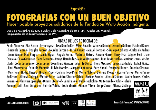 Fundación Watu Acción Indígena organiza una muestra fotográfica en Madrid con el fin de solidarizarse con el mundo indígena. Se trata de una exposición con ochenta obras donadas por grandes fotógrafos cuya recaudación será destinada a causas a favor del mundo indígena. Entre las obras expuestas podrán verse fotografías de Bernard